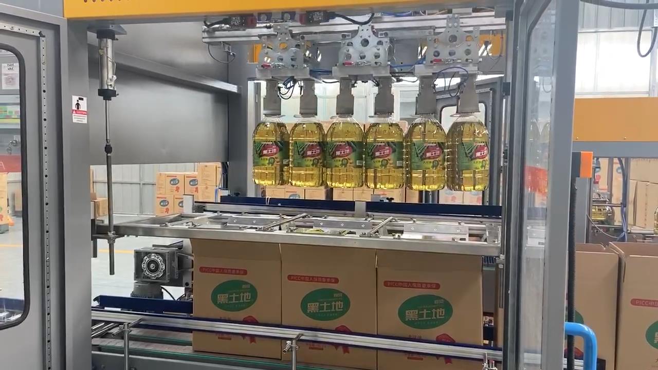 本设备为抓取式装箱机,适用于各类PET、PVC材质瓶型,装箱速度为2000瓶小时(5L),由三菱可编程控制器自动控制进瓶,装箱等过程,并采用进口电器元件和气动元件,保证系统运行稳